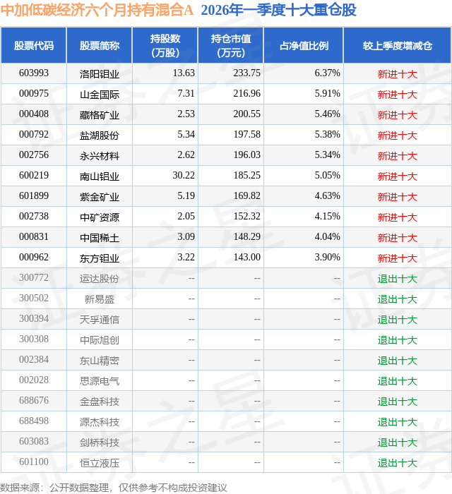 从基金规模来看,中加低碳经济六个月持有混合A基金2026年一季度公布的基金规模为0.26亿元,较上一期规模4864.32万元变化了-2287.56万元,环比变化了-47.03%。该基金最新一期资产配置为:股票占净值比72.54%,无债券类资产,现金占净值比30.65%。从基金持仓来看,该基金当季前十大股票仓位达50.23%,第一大重仓股为洛阳钼业(603993),持仓占比为6.37%。