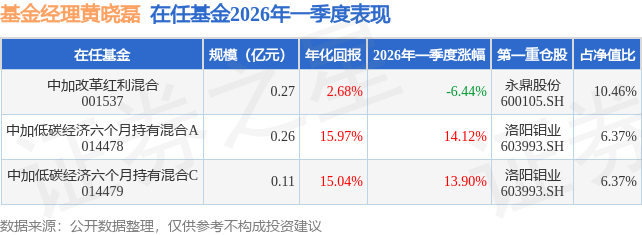 中加低碳经济六个月持有混合A现任基金经理为黄晓磊,本季度增聘基金经理黄晓磊,近期离任的基金经理为张一然。其中在任基金经理黄晓磊已从业3年又41天,2026年3月6日正式接手管理中加低碳经济六个月持有混合A,任职期间累计回报为6.73%。目前还管理着3只基金产品(包括A类和C类),其中本季度表现最佳的基金为中加低碳经济六个月持有混合A(014478),季度净值涨幅为14.12%。