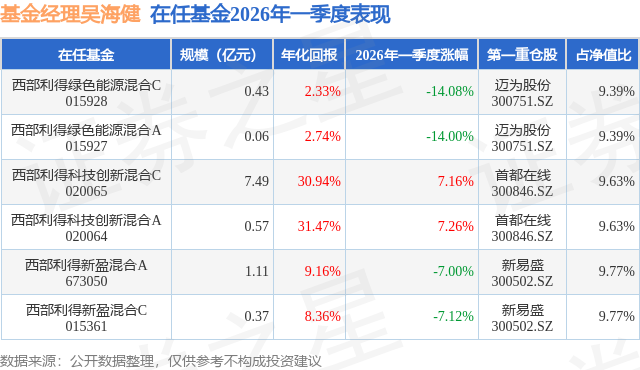 证券之星消息,日前西部利得绿色能源混合C基金公布一季报,2026年一季度最新规模0.43亿元,季度净值涨幅为-14.08%。