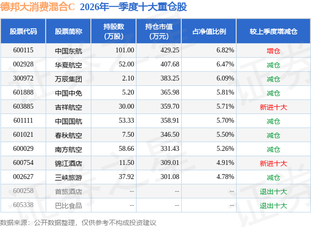 从基金规模来看,德邦大消费混合C基金2026年一季度公布的基金规模为0.34亿元,较上一期规模4168.26万元变化了-781.39万元,环比变化了-18.75%。该基金最新一期资产配置为:股票占净值比93.91%,无债券类资产,现金占净值比6.62%。从基金持仓来看,该基金当季前十大股票仓位达57.05%,第一大重仓股为中国东航(600115),持仓占比为6.82%。
