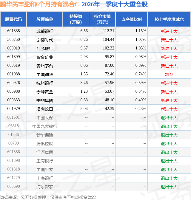 从基金规模来看,鹏华民丰盈和6个月持有混合C基金2026年一季度公布的基金规模为0.02亿元,较上一期规模680.1万元变化了-435.81万元,环比变化了-64.08%。该基金最新一期资产配置为:股票占净值比16.54%,债券占净值比72.89%,现金占净值比4.03%。从基金持仓来看,该基金当季前十大股票仓位达7.93%,第一大重仓股为成都银行(601838),持仓占比为1.15%。