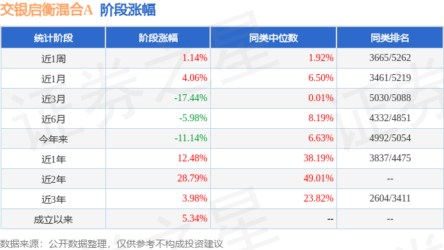 从业绩表现来看,交银启衡混合A基金过去一年净值涨幅为12.48%,在同类基金中排名3837/4475,同类基金过去一年净值涨幅中位数为38.19%。而基金过去一年的最大回撤为-23.44%,成立以来的最大回撤为-33.0%。
