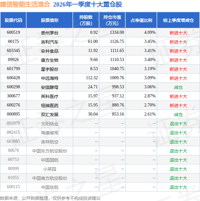 从基金规模来看,建信智能生活混合基金2026年一季度公布的基金规模为3.26亿元,较上一期规模2.31亿元变化了9497.28万元,环比变化了41.06%。该基金最新一期资产配置为:股票占净值比83.71%,无债券类资产,现金占净值比15.44%。从基金持仓来看,该基金当季前十大股票仓位达31.87%,第一大重仓股为贵州茅台(600519),持仓占比为4.09%。