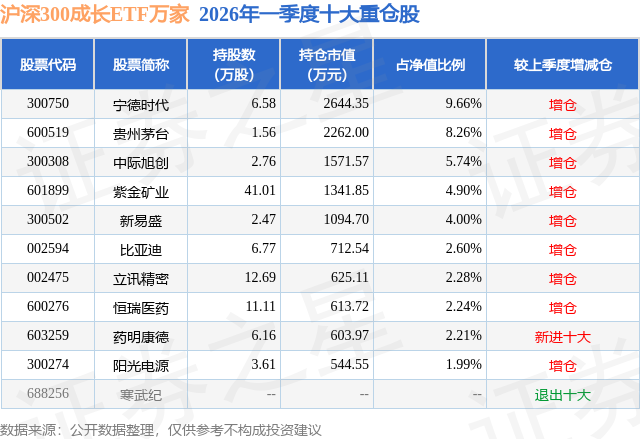 从基金规模来看,沪深300成长ETF万家基金2026年一季度公布的基金规模为2.74亿元,较上一期规模2.42亿元变化了3158.93万元,环比变化了13.04%。该基金最新一期资产配置为:股票占净值比98.91%,无债券类资产,现金占净值比1.2%。从基金持仓来看,该基金当季前十大股票仓位达43.88%,第一大重仓股为宁德时代(300750),持仓占比为9.66%。