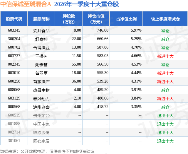 从基金规模来看,中信保诚至瑞混合A基金2026年一季度公布的基金规模为0.89亿元,较上一期规模1.21亿元变化了-3157.35万元,环比变化了-26.1%。该基金最新一期资产配置为:股票占净值比74.98%,无债券类资产,现金占净值比17.16%。从基金持仓来看,该基金当季前十大股票仓位达45.0%,第一大重仓股为安井食品(603345),持仓占比为5.97%。