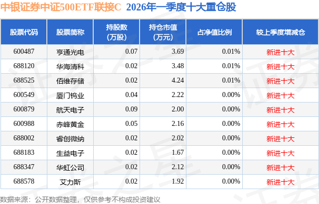从基金规模来看,中银证券中证500ETF联接C基金2026年一季度公布的基金规模为0.85亿元,较上一期规模1835.33万元变化了6647.21万元,环比变化了362.18%。该基金最新一期资产配置为:股票占净值比0.3%,无债券类资产,现金占净值比7.08%。从基金持仓来看,该基金当季前十大股票仓位达0.03%,第一大重仓股为亨通光电(600487),持仓占比为0.01%。