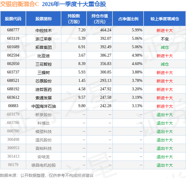 证券之星消息,日前交银启衡混合C基金公布一季报,2026年一季度最新规模0.36亿元,季度净值涨幅为-16.01%。