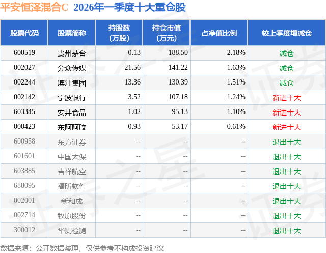 证券之星消息,日前平安恒泽混合C基金公布一季报,2026年一季度最新规模0.38亿元,季度净值涨幅为-1.17%。