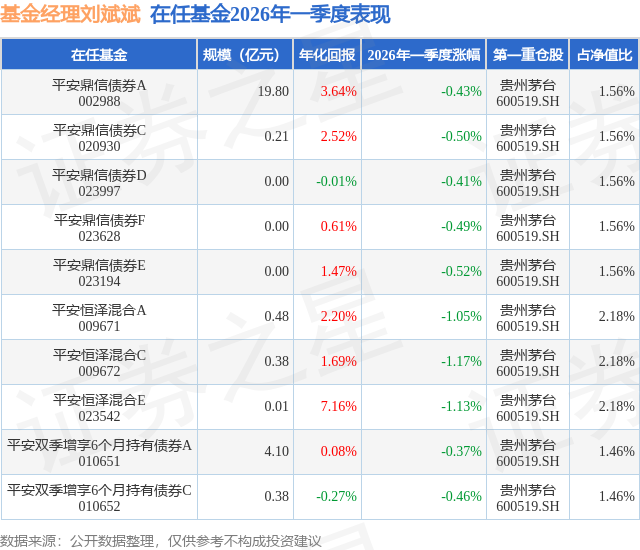 从基金规模来看,平安恒泽混合C基金2026年一季度公布的基金规模为0.38亿元,较上一期规模772.76万元变化了2987.03万元,环比变化了386.54%。该基金最新一期资产配置为:股票占净值比8.28%,债券占净值比42.19%,现金占净值比38.03%。从基金持仓来看,该基金当季前十大股票仓位达8.27%,第一大重仓股为贵州茅台(600519),持仓占比为2.18%。