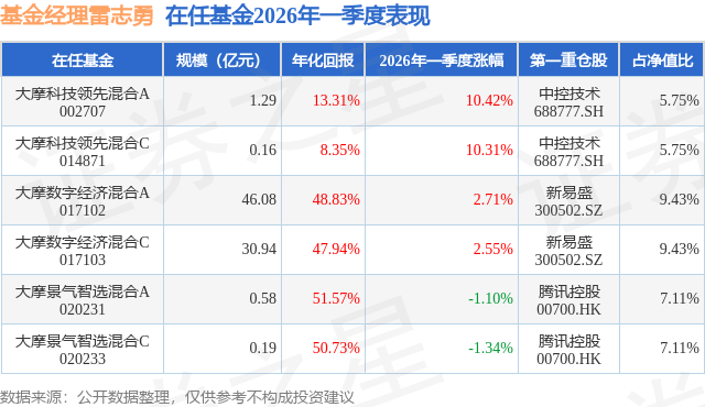 证券之星消息,日前大摩数字经济混合A基金公布一季报,2026年一季度最新规模46.08亿元,季度净值涨幅为2.71%。