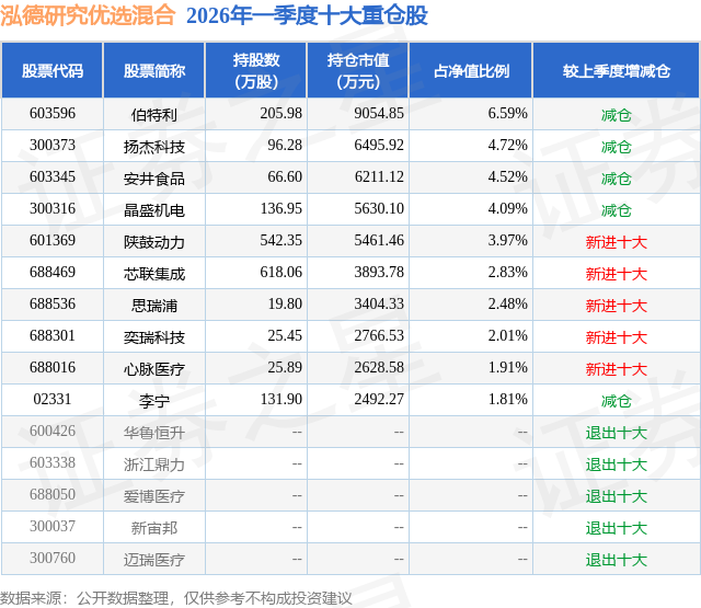 从基金规模来看,泓德研究优选混合基金2026年一季度公布的基金规模为13.75亿元,较上一期规模19.56亿元变化了-5.81亿元,环比变化了-29.69%。该基金最新一期资产配置为:股票占净值比81.89%,债券占净值比2.97%,现金占净值比12.81%。从基金持仓来看,该基金当季前十大股票仓位达34.93%,第一大重仓股为伯特利(603596),持仓占比为6.59%。