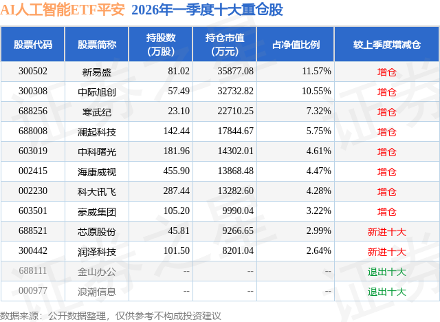 从基金规模来看,AI人工智能ETF平安基金2026年一季度公布的基金规模为31.01亿元,较上一期规模26.8亿元变化了4.21亿元,环比变化了15.72%。该基金最新一期资产配置为:股票占净值比99.99%,无债券类资产,现金占净值比0.14%。从基金持仓来看,该基金当季前十大股票仓位达57.4%,第一大重仓股为新易盛(300502),持仓占比为11.57%。