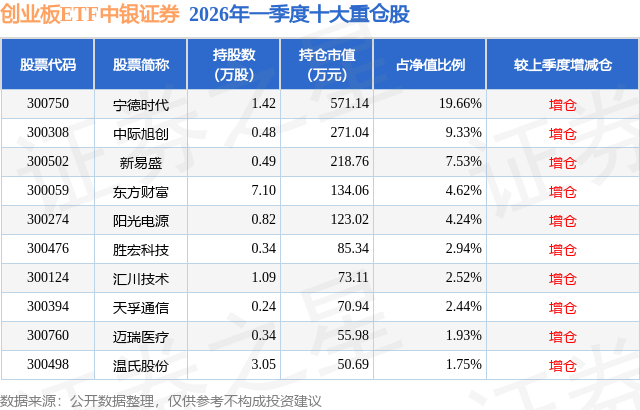 从基金规模来看,创业板ETF中银证券基金2026年一季度公布的基金规模为0.29亿元,较上一期规模1513.41万元变化了1391.16万元,环比变化了91.92%。该基金最新一期资产配置为:股票占净值比99.53%,无债券类资产,现金占净值比0.68%。从基金持仓来看,该基金当季前十大股票仓位达56.96%,第一大重仓股为宁德时代(300750),持仓占比为19.66%。