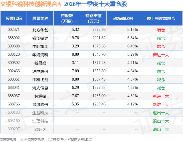 从基金规模来看,交银科锐科技创新混合A基金2026年一季度公布的基金规模为2.75亿元,较上一期规模2.7亿元变化了527.85万元,环比变化了1.96%。该基金最新一期资产配置为:股票占净值比92.92%,债券占净值比6.21%,现金占净值比1.06%。从基金持仓来看,该基金当季前十大股票仓位达53.61%,第一大重仓股为北方华创(002371),持仓占比为8.13%。