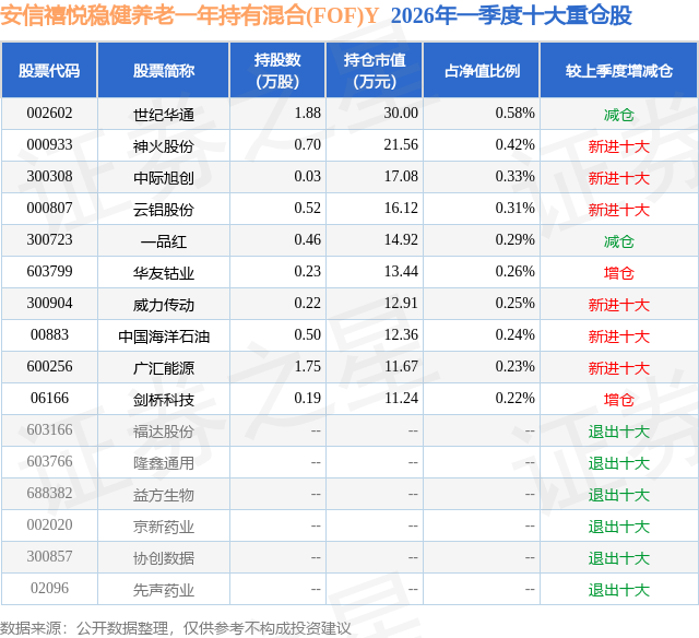 从基金规模来看,安信禧悦稳健养老一年持有混合(FOF)Y基金2026年一季度公布的基金规模为0.0亿元,较上一期规模26.61万元变化了18.76万元,环比变化了70.49%。该基金最新一期资产配置为:股票占净值比3.86%,债券占净值比5.6%,现金占净值比2.78%。从基金持仓来看,该基金当季前十大股票仓位达3.13%,第一大重仓股为世纪华通(002602),持仓占比为0.58%。