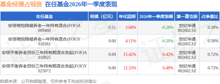 证券之星消息,日前安信禧悦稳健养老一年持有混合(FOF)Y基金公布一季报,2026年一季度最新规模0.0亿元,季度净值涨幅为-0.2%。