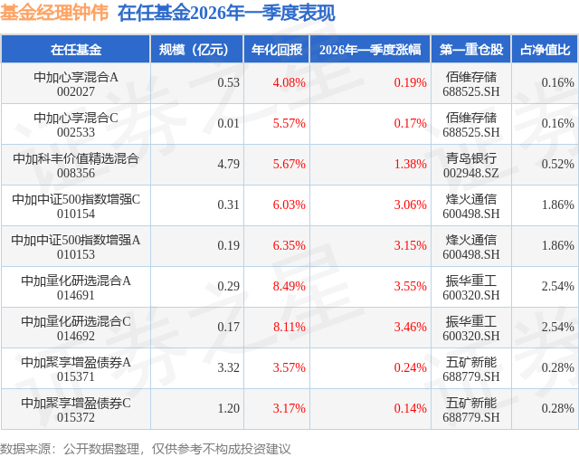 证券之星消息,日前中加中证500指数增强A基金公布一季报,2026年一季度最新规模0.19亿元,季度净值涨幅为3.15%。
