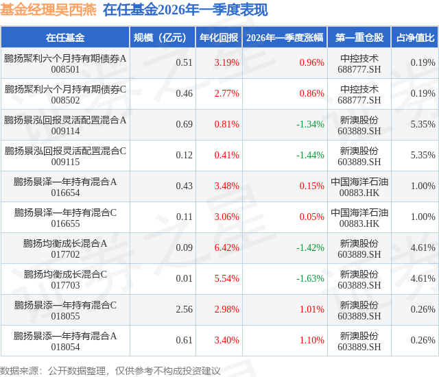 从基金规模来看,鹏扬景泽一年持有混合C基金2026年一季度公布的基金规模为0.11亿元,较上一期规模103.04万元变化了993.37万元,环比变化了964.05%。该基金最新一期资产配置为:股票占净值比9.6%,债券占净值比79.13%,现金占净值比2.57%。从基金持仓来看,该基金当季前十大股票仓位达4.97%,第一大重仓股为中国海洋石油(00883),持仓占比为1.0%。