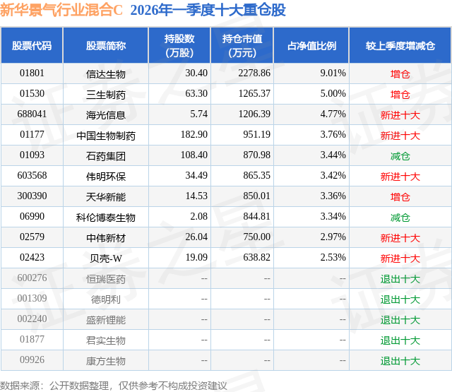 从基金规模来看,新华景气行业混合C基金2026年一季度公布的基金规模为0.42亿元,较上一期规模4457.69万元变化了-223.46万元,环比变化了-5.01%。该基金最新一期资产配置为:股票占净值比92.94%,无债券类资产,现金占净值比5.55%。从基金持仓来看,该基金当季前十大股票仓位达41.6%,第一大重仓股为信达生物(01801),持仓占比为9.01%。