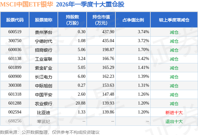 从基金规模来看,MSCI中国ETF银华基金2026年一季度公布的基金规模为1.17亿元,较上一期规模1.4亿元变化了-2333.0万元,环比变化了-16.62%。该基金最新一期资产配置为:股票占净值比97.54%,无债券类资产,现金占净值比2.46%。从基金持仓来看,该基金当季前十大股票仓位达18.35%,第一大重仓股为贵州茅台(600519),持仓占比为3.74%。