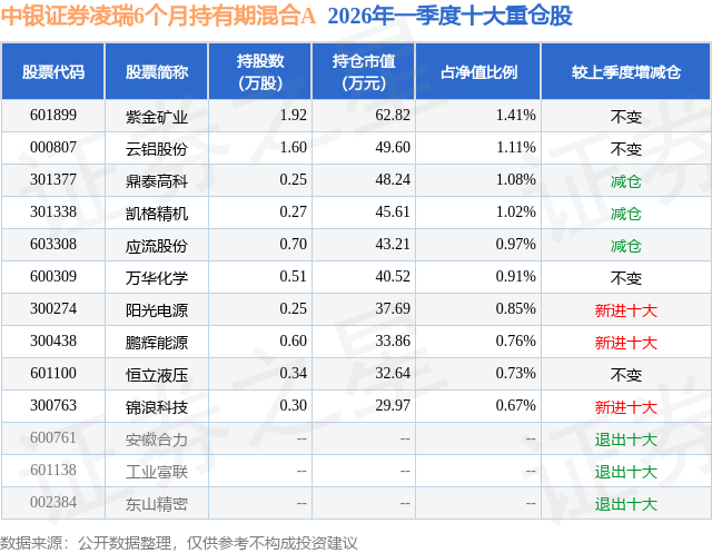 从基金规模来看,中银证券凌瑞6个月持有期混合A基金2026年一季度公布的基金规模为0.13亿元,较上一期规模2569.18万元变化了-1305.64万元,环比变化了-50.82%。该基金最新一期资产配置为:股票占净值比22.53%,债券占净值比76.24%,现金占净值比0.71%。从基金持仓来看,该基金当季前十大股票仓位达9.51%,第一大重仓股为紫金矿业(601899),持仓占比为1.41%。