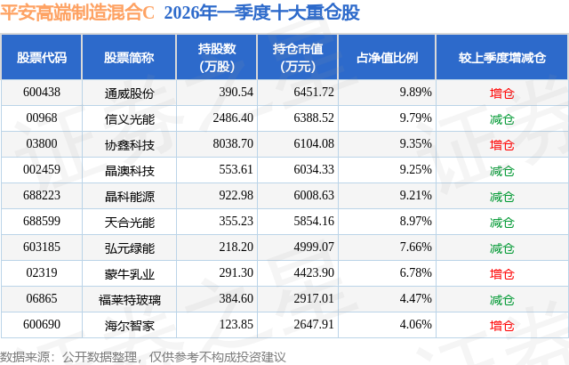 从基金规模来看,平安高端制造混合C基金2026年一季度公布的基金规模为3.89亿元,较上一期规模1.86亿元变化了2.03亿元,环比变化了109.1%。该基金最新一期资产配置为:股票占净值比93.75%,债券占净值比0.56%,现金占净值比5.81%。从基金持仓来看,该基金当季前十大股票仓位达79.43%,第一大重仓股为通威股份(600438),持仓占比为9.89%。