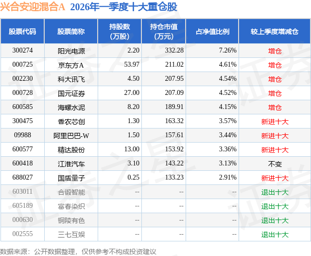 从基金规模来看,兴合安迎混合A基金2026年一季度公布的基金规模为0.07亿元,较上一期规模542.7万元变化了145.93万元,环比变化了26.89%。该基金最新一期资产配置为:股票占净值比84.41%,无债券类资产,现金占净值比15.82%。从基金持仓来看,该基金当季前十大股票仓位达41.49%,第一大重仓股为阳光电源(300274),持仓占比为7.26%。