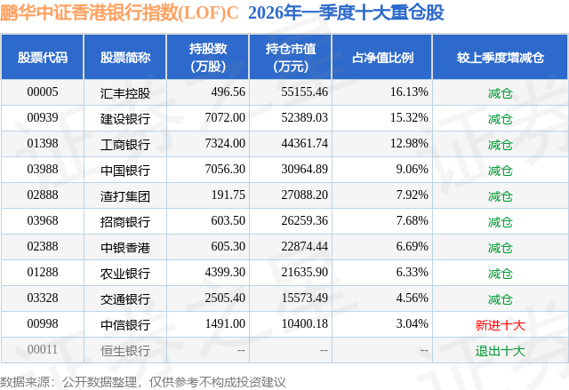 从基金规模来看,鹏华中证香港银行指数(LOF)C基金2026年一季度公布的基金规模为24.14亿元,较上一期规模38.2亿元变化了-14.06亿元,环比变化了-36.81%。该基金最新一期资产配置为:股票占净值比94.87%,无债券类资产,现金占净值比9.24%。从基金持仓来看,该基金当季前十大股票仓位达89.71%,第一大重仓股为汇丰控股(00005),持仓占比为16.13%。