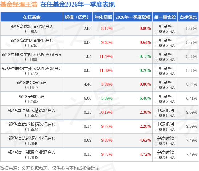 证券之星消息,日前银华清洁能源产业混合A基金公布一季报,2026年一季度最新规模0.13亿元,季度净值涨幅为4.72%。