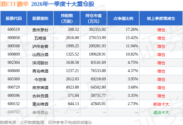 证券之星消息,日前酒ETF鹏华基金公布一季报,2026年一季度最新规模175.21亿元,季度净值涨幅为-8.21%。