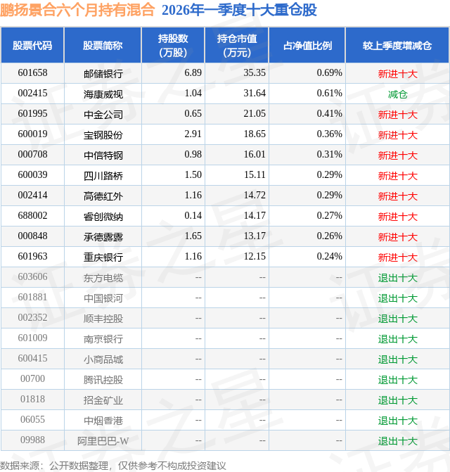 从基金规模来看,鹏扬景合六个月持有混合基金2026年一季度公布的基金规模为0.52亿元,较上一期规模3.09亿元变化了-2.57亿元,环比变化了-83.32%。该基金最新一期资产配置为:股票占净值比14.58%,债券占净值比73.0%,现金占净值比10.59%。从基金持仓来看,该基金当季前十大股票仓位达3.73%,第一大重仓股为邮储银行(601658),持仓占比为0.69%。