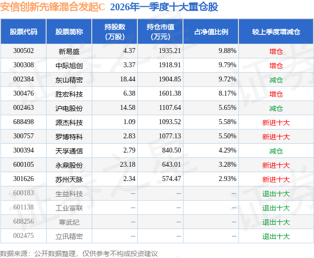 从基金规模来看,安信创新先锋混合发起C基金2026年一季度公布的基金规模为1.53亿元,较上一期规模7492.38万元变化了7761.63万元,环比变化了103.59%。该基金最新一期资产配置为:股票占净值比94.7%,债券占净值比5.51%,现金占净值比3.57%。从基金持仓来看,该基金当季前十大股票仓位达64.79%,第一大重仓股为新易盛(300502),持仓占比为9.88%。