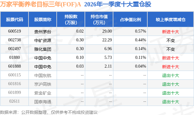 从基金规模来看,万家平衡养老目标三年(FOF)A基金2026年一季度公布的基金规模为0.32亿元,较上一期规模2.11亿元变化了-1.79亿元,环比变化了-84.92%。该基金最新一期资产配置为:股票占净值比1.3%,无债券类资产,现金占净值比11.1%。从基金持仓来看,该基金当季前十大股票仓位达1.3%,第一大重仓股为贵州茅台(600519),持仓占比为0.57%。