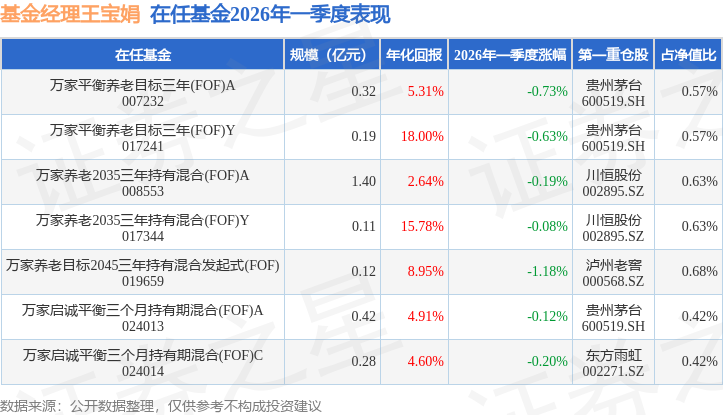 证券之星消息,日前万家平衡养老目标三年(FOF)A基金公布一季报,2026年一季度最新规模0.32亿元,季度净值涨幅为-0.73%。