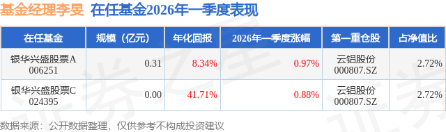 从基金规模来看,银华兴盛股票A基金2026年一季度公布的基金规模为0.31亿元,较上一期规模4757.57万元变化了-1619.76万元,环比变化了-34.05%。该基金最新一期资产配置为:股票占净值比91.69%,无债券类资产,现金占净值比8.49%。从基金持仓来看,该基金当季前十大股票仓位达16.2%,第一大重仓股为云铝股份(000807),持仓占比为2.72%。