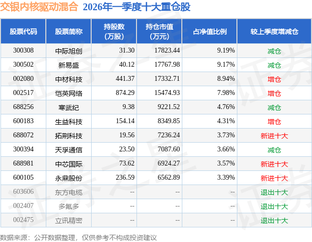 从基金规模来看,交银内核驱动混合基金2026年一季度公布的基金规模为19.39亿元,较上一期规模19.14亿元变化了2515.14万元,环比变化了1.31%。该基金最新一期资产配置为:股票占净值比89.44%,无债券类资产,现金占净值比10.87%。从基金持仓来看,该基金当季前十大股票仓位达58.7%,第一大重仓股为中际旭创(300308),持仓占比为9.19%。