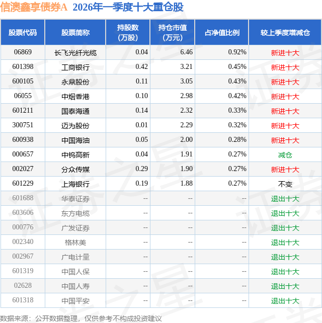 从基金规模来看,信澳鑫享债券A基金2026年一季度公布的基金规模为0.07亿元,较上一期规模2465.36万元变化了-1780.53万元,环比变化了-72.22%。该基金最新一期资产配置为:股票占净值比6.76%,债券占净值比83.81%,现金占净值比4.1%。从基金持仓来看,该基金当季前十大股票仓位达3.96%,第一大重仓股为长飞光纤光缆(06869),持仓占比为0.92%。
