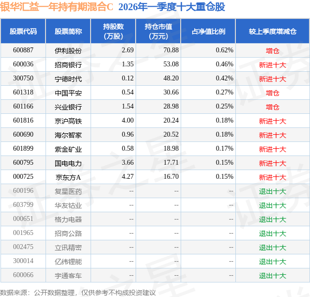 从基金规模来看,银华汇益一年持有期混合C基金2026年一季度公布的基金规模为0.35亿元,较上一期规模561.77万元变化了2956.74万元,环比变化了526.32%。该基金最新一期资产配置为:股票占净值比9.25%,债券占净值比88.1%,现金占净值比7.49%。从基金持仓来看,该基金当季前十大股票仓位达2.85%,第一大重仓股为伊利股份(600887),持仓占比为0.62%。