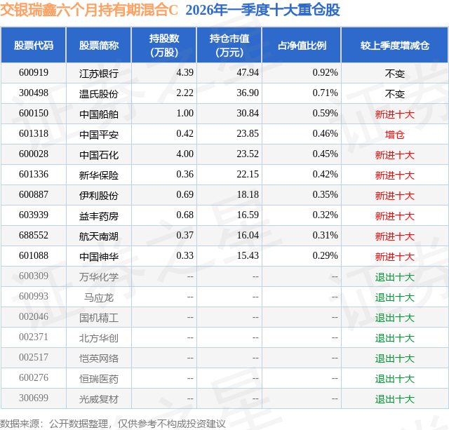 从基金规模来看,交银瑞鑫六个月持有期混合C基金2026年一季度公布的基金规模为0.01亿元,较上一期规模4.19万元变化了131.38万元,环比变化了3136.13%。该基金最新一期资产配置为:股票占净值比10.22%,债券占净值比50.46%,现金占净值比5.89%。从基金持仓来看,该基金当季前十大股票仓位达4.82%,第一大重仓股为江苏银行(600919),持仓占比为0.92%。