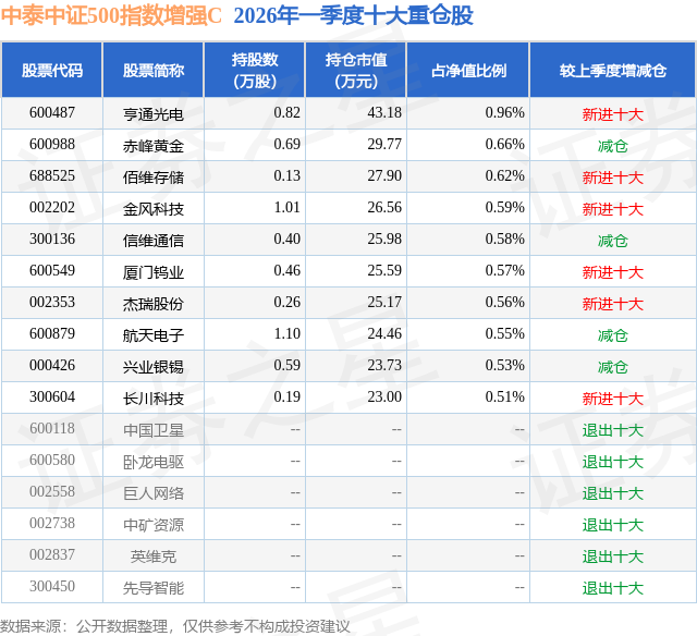 从基金规模来看,中泰中证500指数增强C基金2026年一季度公布的基金规模为0.28亿元,较上一期规模4445.24万元变化了-1662.78万元,环比变化了-37.41%。该基金最新一期资产配置为:股票占净值比89.27%,无债券类资产,现金占净值比10.77%。从基金持仓来看,该基金当季前十大股票仓位达6.13%,第一大重仓股为亨通光电(600487),持仓占比为0.96%。