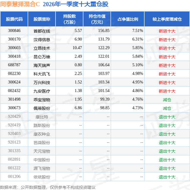 从基金规模来看,同泰慧择混合C基金2026年一季度公布的基金规模为0.14亿元,较上一期规模609.92万元变化了761.25万元,环比变化了124.81%。该基金最新一期资产配置为:股票占净值比87.5%,无债券类资产,现金占净值比1.67%。从基金持仓来看,该基金当季前十大股票仓位达54.89%,第一大重仓股为首都在线(300846),持仓占比为7.51%。