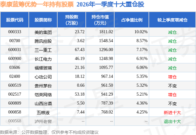 从基金规模来看,泰康蓝筹优势一年持有股票基金2026年一季度公布的基金规模为1.81亿元,较上一期规模3.4亿元变化了-1.59亿元,环比变化了-46.82%。该基金最新一期资产配置为:股票占净值比87.51%,债券占净值比5.64%,现金占净值比3.66%。从基金持仓来看,该基金当季前十大股票仓位达63.22%,第一大重仓股为美的集团(000333),持仓占比为10.02%。