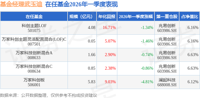 从基金规模来看,万家科技创新混合A基金2026年一季度公布的基金规模为1.66亿元,较上一期规模1.68亿元变化了-170.16万元,环比变化了-1.01%。该基金最新一期资产配置为:股票占净值比90.32%,无债券类资产,现金占净值比8.51%。从基金持仓来看,该基金当季前十大股票仓位达47.51%,第一大重仓股为兆易创新(603986),持仓占比为6.63%。