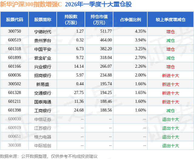 从基金规模来看,新华沪深300指数增强C基金2026年一季度公布的基金规模为0.43亿元,较上一期规模1995.87万元变化了2304.53万元,环比变化了115.46%。该基金最新一期资产配置为:股票占净值比94.51%,无债券类资产,现金占净值比9.76%。从基金持仓来看,该基金当季前十大股票仓位达25.01%,第一大重仓股为宁德时代(300750),持仓占比为4.35%。