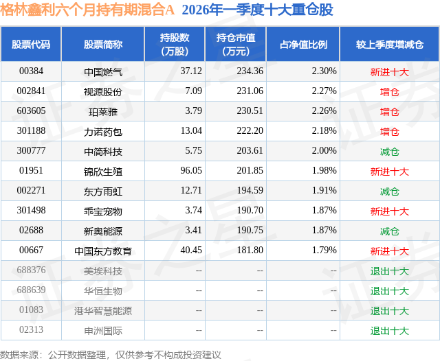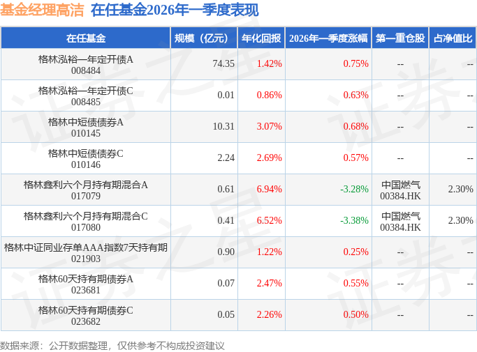 从基金规模来看,格林鑫利六个月持有期混合A基金2026年一季度公布的基金规模为0.61亿元,较上一期规模102.26万元变化了5990.17万元,环比变化了5857.9%。该基金最新一期资产配置为:股票占净值比29.49%,债券占净值比28.92%,现金占净值比6.9%。从基金持仓来看,该基金当季前十大股票仓位达20.43%,第一大重仓股为中国燃气(00384),持仓占比为2.3%。