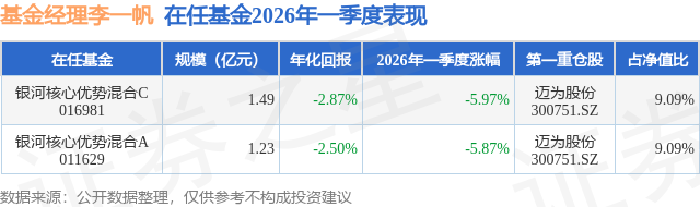 证券之星消息,日前银河核心优势混合C基金公布一季报,2026年一季度最新规模1.49亿元,季度净值涨幅为-5.97%。