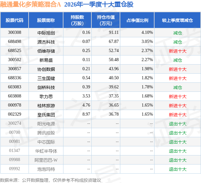 从基金规模来看,融通量化多策略混合A基金2026年一季度公布的基金规模为0.2亿元,较上一期规模2103.05万元变化了-103.14万元,环比变化了-4.9%。该基金最新一期资产配置为:股票占净值比93.33%,无债券类资产,现金占净值比8.56%。从基金持仓来看,该基金当季前十大股票仓位达22.35%,第一大重仓股为中际旭创(300308),持仓占比为4.1%。