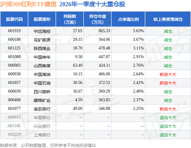 从基金规模来看,沪深300红利ETF建信基金2026年一季度公布的基金规模为1.54亿元,较上一期规模1.63亿元变化了-914.25万元,环比变化了-5.61%。该基金最新一期资产配置为:股票占净值比99.78%,无债券类资产,现金占净值比0.29%。从基金持仓来看,该基金当季前十大股票仓位达30.16%,第一大重仓股为中远海控(601919),持仓占比为5.63%。