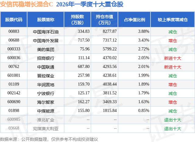 从基金规模来看,安信民稳增长混合C基金2026年一季度公布的基金规模为6.17亿元,较上一期规模8.27亿元变化了-2.11亿元,环比变化了-25.49%。该基金最新一期资产配置为:股票占净值比44.61%,债券占净值比48.91%,现金占净值比1.78%。从基金持仓来看,该基金当季前十大股票仓位达22.24%,第一大重仓股为中国海洋石油(00883),持仓占比为3.88%。