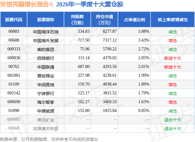 从基金规模来看,安信民稳增长混合A基金2026年一季度公布的基金规模为15.16亿元,较上一期规模22.94亿元变化了-7.78亿元,环比变化了-33.91%。该基金最新一期资产配置为:股票占净值比44.61%,债券占净值比48.91%,现金占净值比1.78%。从基金持仓来看,该基金当季前十大股票仓位达22.24%,第一大重仓股为中国海洋石油(00883),持仓占比为3.88%。
